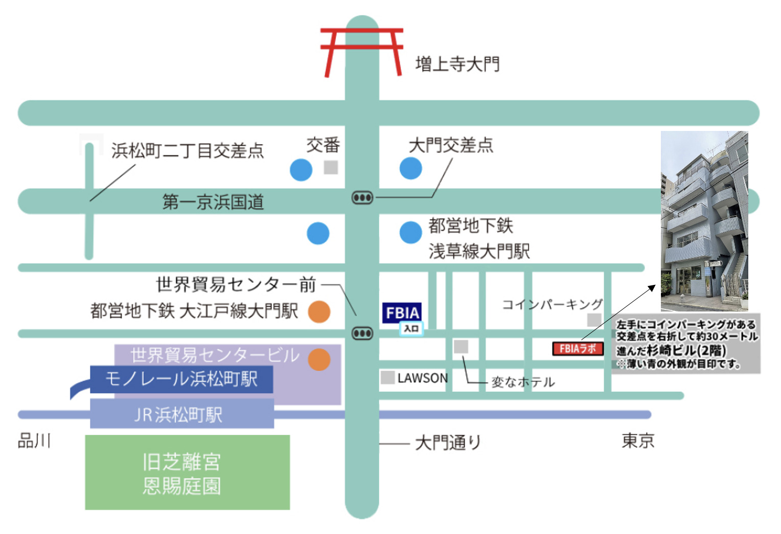 1.JR浜松町駅の北口をでて増上寺方面に直進してください。1つ目の信号(世界貿易センタービル前)を右にわたり、富士港運の看板があるビルを左手に見て、路地を直進。